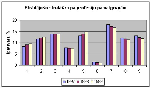 Profesionālā izglītība un darba tirgus LatvijāProfesijas un iemaņas. Piedāvājums un pieprasījumsDarba tirgū pieprasītās profesijas un iemaņasIzmaiņas profesiju pieprasījumā ir redzamas, salīdzinot dažādu gadu LR CSP Profesiju apsekojumu rezultātus. Tajos profesijas ir klasificētas atbilstoši LR Profesiju klasifikatoram. 1.pamatgrupa ir likumdevēji, valsts vecākās amatpersonas, vadītāji (grupā ietilpst arī vietējo pašvaldību vadītāji un dažādu līmeņu iestāžu un organizāciju vadītāji); 2. – vecākie speciālisti (grupā ietilpst profesijas, kuru izpildei vajadzīgs augsts teorētisko un praktisko zināšanu līmenis dabas, sociālajās un humanitārajās zinātnēs); 3.- speciālisti (grupā ietilpst profesijas, kur nepieciešamas tehniskās zināšanas tehnikas, dabas, sociālo un humanitāro zinātņu nozarēs); 4. – kalpotāji (sekretāri, kasieri, klientu informētāji, uzskaites, finansu un citi kancelejas darbinieki); 5. – pakalpojumu un tirdzniecības darbinieki (pārdevēji, sabiedriskās ēdināšanas, apsardzes, aprūpes un citu pakalpojumu veidu darbinieki); 6. – kvalificēti lauksaimniecības un zivsaimniecības darbinieki (dārzeņu, labības un lopu audzētāji, mežkopji, zivsaimniecības darbinieki un mednieki); 7 – kvalificēti strādnieki un amatnieki (grupā ietilpst dažādu nozaru strādnieki un amatnieki, kuriem ir nepieciešamās zināšanas, pieredze un amata prasme); 8. – iekārtu un mašīnu operatori un izstrādājumu montieri (grupā ietilpst profesijas, kurās nepieciešamas zināšanas un prasme rūpniecisku mašīnu un iekārtu vadīšanā un apkalpošanā); 9.- vienkāršās profesijas (apkopēji, uzraugi, sētnieki, transporta strādnieki un citi nekvalificētu darbu veicēji celtniecībā, lauksaimniecībā, mežniecībā un citur). Profesionālās izglītības sistēmā var apgūt 4., 5., 6., 7., 8.pamatgrupas profesijas. Kā redzams 12.attēlā, visstraujāk audzis pakalpojumu un tirdzniecības darbinieku (5.pamatgrupa) īpatsvars (13,2% – 1997.g.; 14,9% – 1999.g.; 15,2% – 2000.g.), bet samazinājies kvalificētu strādnieku un amatnieku (7.pamatgrupa) īpatsvars (18,1% – 1997.g.; 16,7% – 1999.g.; 16,5% – 2000.g). Tomēr vēl joprojām šī grupa veido lielāko īpatsvaru strādājošo kopskaitā. Jaunieši visvairāk 1999.gada oktobrī strādāja par pakalpojumu un tirdzniecības darbiniekiem (25% no strādājošiem vecuma grupā 15 – 24gadi), kā arī par kvalificētiem strādniekiem un amatniekiem (20% no strādājošiem vecumā 15 – 24 gadi). Apkopojot laikrakstos “Diena” un “Čas”, interneta lapās www.cv.lv un www.doska.lv 2001.gada janvāra mēnesī ievietotos 882 darba piedāvājumus, redzams, ka visvairāk vajadzīgi pārdevēji, pārdošanas vadītāji, mārketinga speciālisti (minēti 194 sludinājumos), informācijas tehnoloģiju speciālisti (107); sekretāres, biroja vadītāji (56); grāmatveži, ekonomisti (57); strādnieki, krāvēji (56); inženieri (39). Darba devēji 393 sludinājumos min, ka potenciālajam darba devējam ir nepieciešama augstākā izglītība, bet 489 tā netiek prasīta. Ar augstāko izglītību visvairāk ir pieprasīti dažādi informācijas tehnoloģiju speciālisti (minēti 71 sludinājumā), domājams, ka fakts, ka vienā trešdaļā sludinājumu (kopā 36) šīs nozares speciālistiem netiek prasīta augstākā izglītība, bet tikai darba pieredze, liecina, ka pieprasījums pēc tiem ir ļoti liels un darba devējiem tik ļoti ir nepieciešami darbinieki, ka viņi dara visu, lai sev piesaistītu šos speciālistus. Pēc tam seko pieprasījums pēc dažāda veida pārdošanas vadītājiem un mārketinga speciālistiem (minēti 68 sludinājumos). 1.tabulā apkopotas desmit pieprasītākās profesijas, kurām netiek prasīta augstākā izglītība. Kā redzams, vislielākais pieprasījums gan 2000.gada sākumā, gan 2001.gada janvārī ir pēc pārdevējiem. Zīmīgi, ka tas gandrīz divas reizes pārsniedz pieprasījumu pēc citām profesijām. Tas nozīmē, ka tirgū ir preču pārprodukcija, un svarīgākais ir nevis saražot, bet saražoto pārdot. 1.tabula. Pieprasītākās profesijas, kurām nav nepieciešama augstākā izglītība