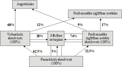 Populārākās studiju programmās ir arī vislielākais uzņemšanas konkurss. Pēc IZM datiem 2000./01.m.g. Latvijas augstskolās vislielākais konkurss bija tiesību zinātnēs – 12,1; ekonomikā – 6,0; datorzinātnēs – 3,3. Vērtējot kopumā, tās studiju programmas, kas bija populāras pirms 5 – 6 gadiem, ir populāras arī šajā mācību gadā. Lai gan aptaujas rezultāti parāda jauniešu priekšstatus par populārākajām profesijām, jāatceras, ka no 1999.gada aptaujas dalībniekiem tikai 33% 9. klašu skolēnu un 32% 12. klašu skolēnu var norādīt, ka ir izvēlējušies savu nākamo profesiju. Skolēnu turpmākā ceļa izvēle 1999.gadāPKIC 1999.gada vidusskolas absolventu aptaujas dati liecina, ka 5% 12. klašu audzēkņu plāno turpināt izglītību profesionālās izglītības iestādēs, bet statistikas dati rāda, ka reāli iestājas 11% beidzēju, tas liek domāt, ka profesionālās izglītības iestādes piesaista to audzēkņu daļu, kas nav īsti izlēmuši, ko darīt tālāk, un tos, kas neiztur konkursu vai nespēj samaksāt par augstāko izglītību. Šāda tendence vērojama arī iepriekšējos gados. Katru gadu pieaug arī to 12. klases skolēnu skaits, kas pēc vidusskolas beigšanas plāno mācības apvienot ar darbu, 1997. gadā tā domāja 21% aptaujāto, bet 1999. gadā – 28%. Nepieciešamība pelnīt arī studiju laikā uzliek papildus slodzi gan studentiem, gan izglītības iestādēm un zināmā mērā ietekmē arī iegūtās izglītības kvalitāti, tai pat laikā dodot daudz lielāku praktiskā darba pieredzi. |